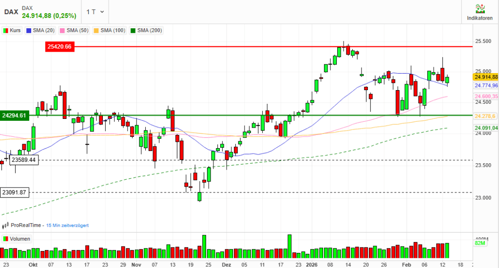1) DAX bleibt vor dem Wochenende in Wartestellung – die 25.000 wird erneut zur psychologischen und technischen Hürde.