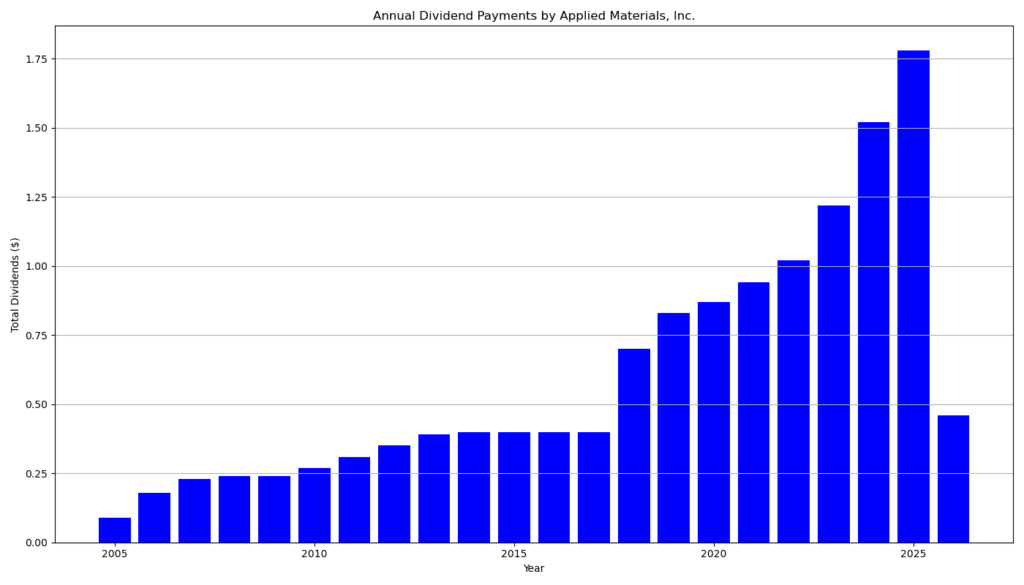 Applied Materials maintains a long and steadily improving dividend track record. The company has paid uninterrupted dividends for 20 consecutive years and delivered eight consecutive years of dividend increases before the latest raise extended the streak to nine.