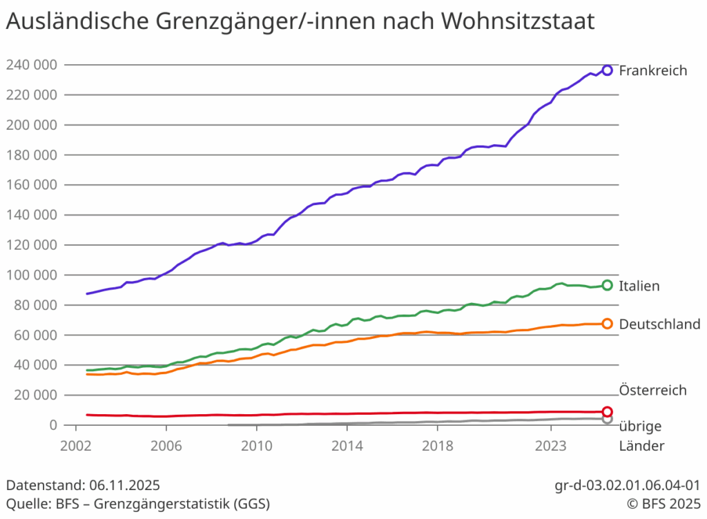 Etwas mehr als die Hälfte aller Grenzgängerinnen und Grenzgänger hatten ihren Wohnsitz in Frankreich (57,6%). Ebenfalls grosse Anteile wohnten in Italien (22,7%) und in Deutschland (16,5%). Über die letzten fünf Jahre hinweg stieg die Anzahl von 342 000 im 3. Quartal 2020 auf 410 000 im 3. Quartal 2025. Dies entspricht einem Wachstum von 19,9%.