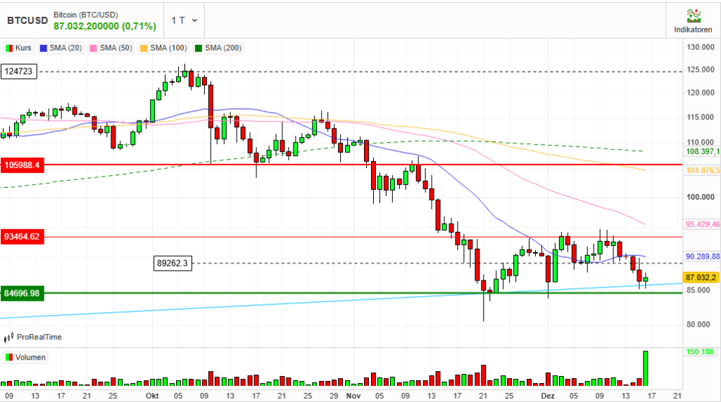 Bitcoin befindet sich kurzfristig in einem klaren Abwärtstrend, testet eine zentrale Unterstützungszone um 85.000–87.000 USD und zeigt bislang keine belastbaren Signale für eine nachhaltige Trendwende.