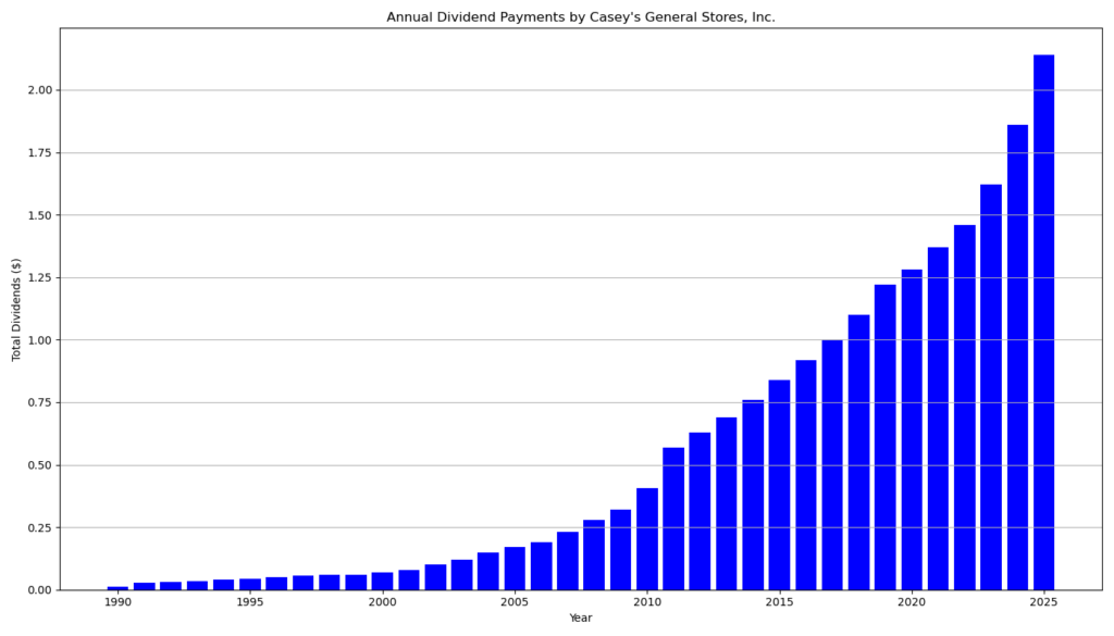 Casey’s has built one of the longest dividend growth records in the retail convenience store sector. The company has delivered 36 consecutive years of dividend increases and 35 consecutive years of uninterrupted dividend payments.