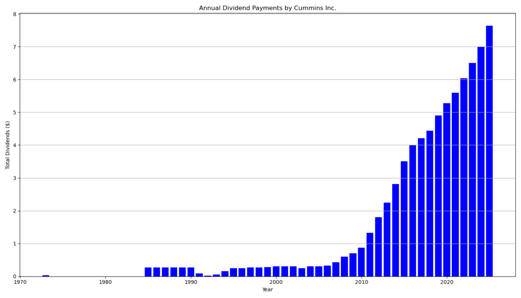 Cummins zahlt seit 36 Jahren ununterbrochen Dividenden. Seit 20 Jahren erhöht das Unternehmen die Ausschüttung ohne Unterbrechung. Die Historie zeigt einen klaren langfristigen Aufwärtstrend. Während die Dividende in den 1990er- und frühen 2000er-Jahren stagnierte oder schwankte, beschleunigte sich das Wachstum ab 2010 deutlich.
