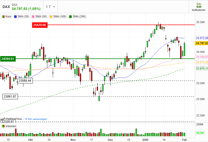 Der DAX war am Morgen zeitweise unter die Marke von 24.400 Punkten gefallen, konnte diese Schwäche jedoch vollständig abschütteln. Die Erholung setzte insbesondere am Nachmittag ein, parallel zur Stabilisierung der US-Börsen und besseren Stimmungsindikatoren .