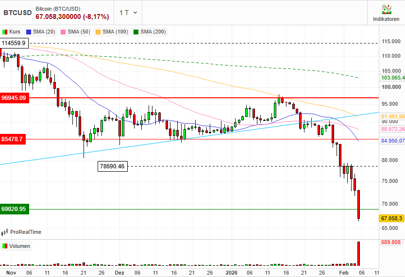 Breiter „Risk-off“-Tag über Anlageklassen hinweg: Silber erneut zweistellig schwächer, Bitcoin deutlich unter Druck – Volatilität zieht an.