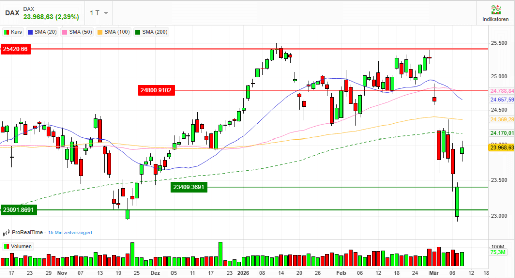 Der deutsche Aktienmarkt zeigte eine deutliche Erholungsbewegung. Der DAX legte kräftig zu und näherte sich wieder der Marke von 24.000 Punkten. Auslöser war vor allem eine Entspannung am Ölmarkt, nachdem Hoffnungen auf ein baldiges Ende des Iran-Konflikts aufkamen. Sinkende Energiepreise reduzierten kurzfristig Inflationssorgen und erhöhten die Risikobereitschaft der Anleger.