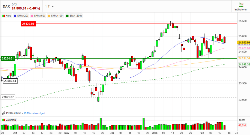 Der DAX zeigte am 16. Februar 2026 einen rückläufigen Trend mit einem Verlust von 0,46% gegenüber dem Vortag.