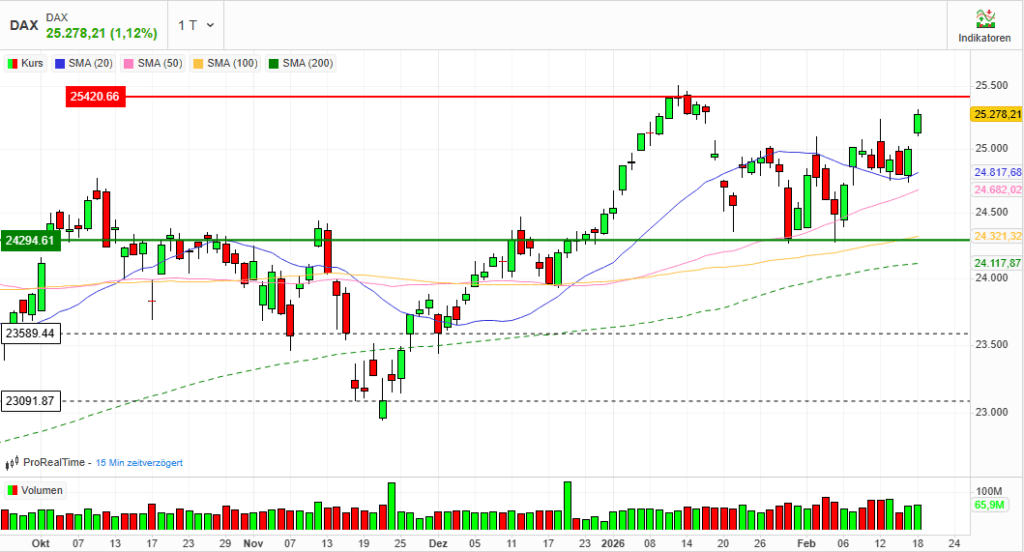 Trotz positiver Tagesbewegung bleibt die übergeordnete Konsolidierung intakt . Entscheidend wird sein, ob sich der DAX nachhaltig oberhalb von 25.000 Punkten etablieren kann.