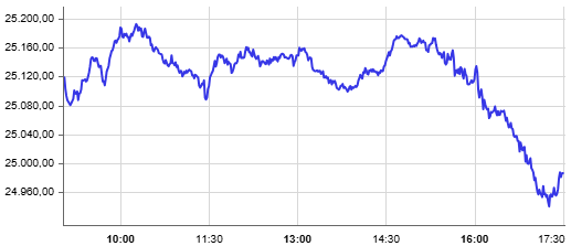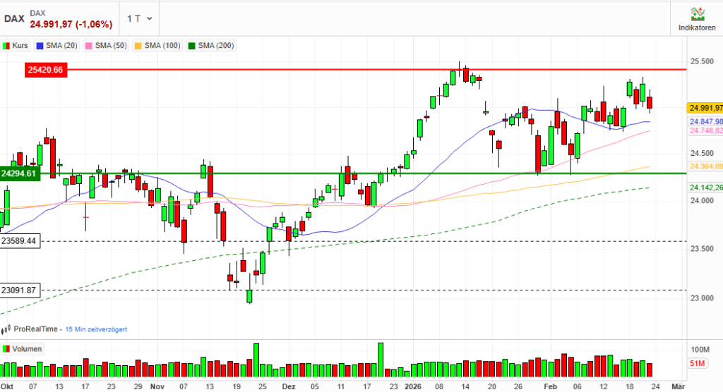 Der DAX verlor zum Wochenstart 1,06 Prozent und schloss bei 24.991,97 Punkten . Damit fiel der Leitindex erneut unter die psychologisch wichtige Marke von 25.000 Punkten. Das Rekordhoch von 25.507 Punkten rückt wieder in weitere Ferne.