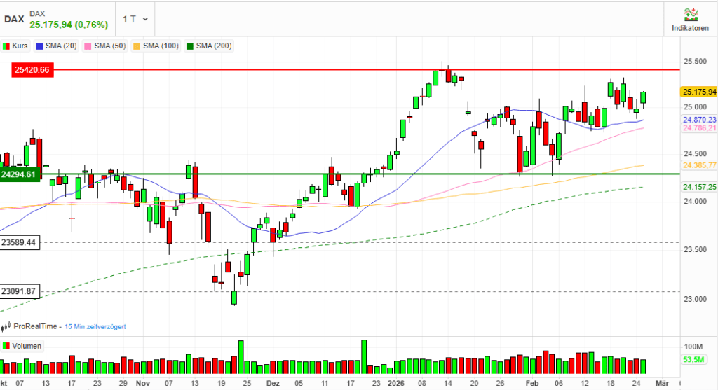 Freundlich, aber fragil. Die Rückkehr über 25.000 Punkte wirkt technisch konstruktiv, steht jedoch unter dem Vorbehalt externer Impulse – insbesondere aus den USA.