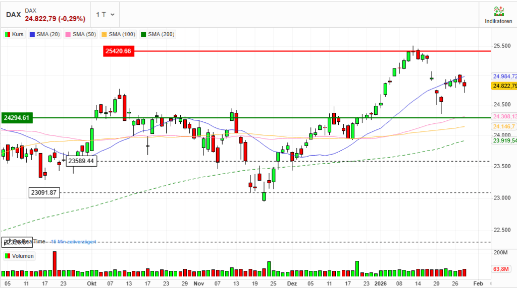 Der DAX schloss mit einem Minus von rund 0,3 % bei 24.822 Punkten. Damit bleibt der Leitindex knapp unter der psychologisch wichtigen Marke von 25.000 Punkten, die zuletzt zwar kurzzeitig überschritten, aber nicht nachhaltig verteidigt werden konnte. Auch der MDAX gab leicht nach und verlor etwa 0,28 % auf rund 31.640 Punkte.