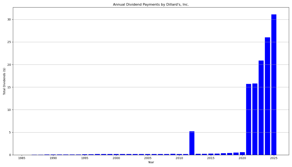 In addition to the regular dividend, Dillard’s has distributed substantial special dividends in recent years. These included $15.00 in 2021, $15.00 in 2022, $20.00 in 2023, $25.00 in 2024, and $30.00 in December 2025. These extraordinary payments significantly enhanced total shareholder yield but remain discretionary.