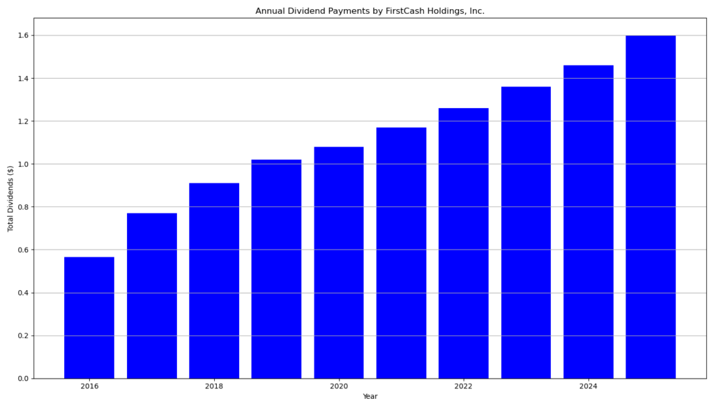 Die Dividende ist solide, aber moderat. Die Payout-Quote bleibt bewusst niedrig, da FirstCash einen großen Teil des Cashflows in Expansion und Akquisitionen reinvestiert. Für Einkommensinvestoren ist die Aktie daher eher wachstumsorientiert mit Dividendenbeimischung.