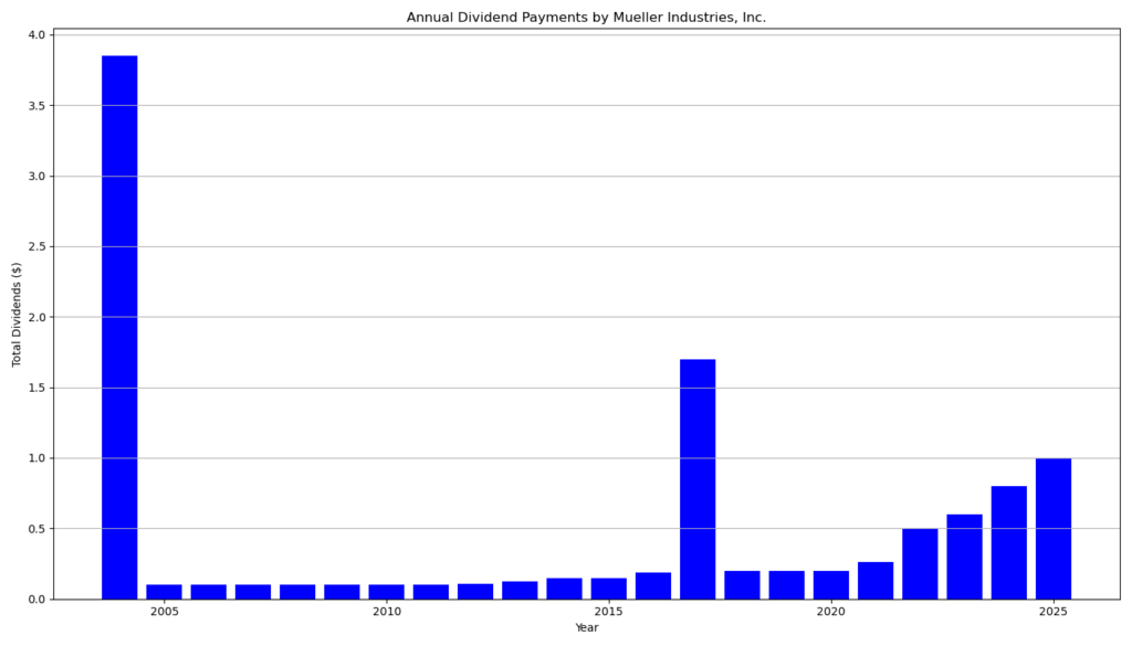 Mueller has paid uninterrupted dividends for 21 consecutive years. The company has increased its regular dividend for five consecutive years. The historical record shows a long period of stable $0.025 quarterly payments from 2004 through 2011. Management initiated a structural growth phase beginning in 2012. Since 2021, the quarterly dividend has accelerated from $0.065 to $0.125 in 2022, $0.150 in 2023, $0.200 in 2024, $0.250 in 2025, and now $0.35 in 2026.