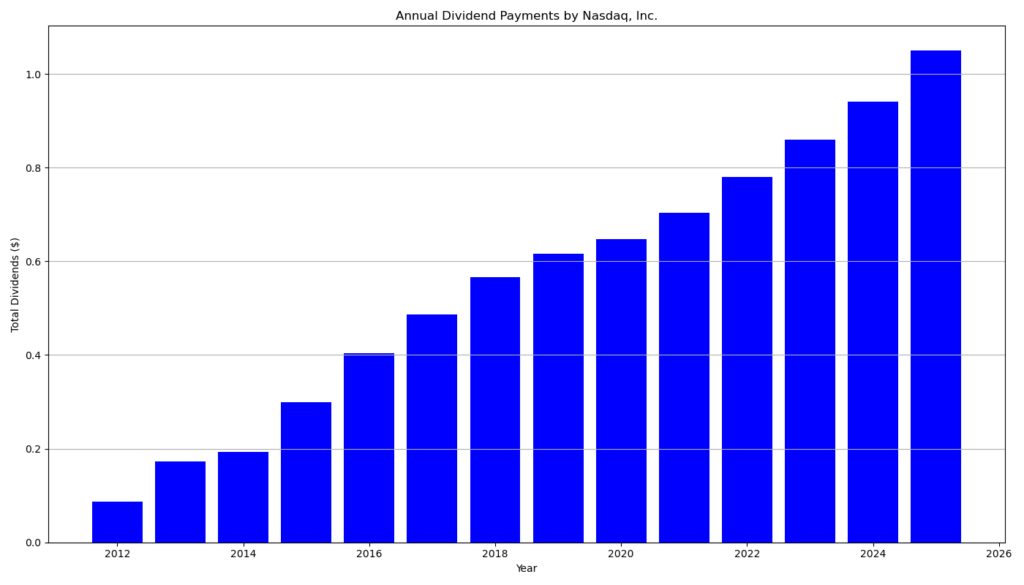 Nasdaq zahlt seit 14 Jahren ohne Unterbrechung eine Dividende und steigerte sie in diesen 13 Jahren ebenfalls jedes Jahr. Das ist ein starkes Qualitätssignal, weil es auf planbare Cashflows und disziplinierte Kapitalallokation hindeutet.