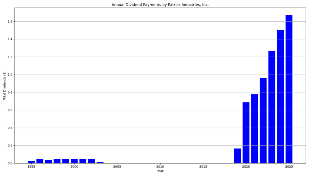 Patrick Industries zahlt seit sechs Jahren ohne Unterbrechung Dividenden und weist ebenso sechs aufeinanderfolgende Jahre mit Dividendenwachstum auf. Seit dem Wiederaufbau der Dividendenpolitik ab 2019 hat das Unternehmen die Ausschüttung mehrfach deutlich angehoben. Allein zwischen 2020 und Ende 2025 stieg die Quartalsdividende von 0,17 $ auf 0,47 $. Diese Entwicklung entspricht einer hohen durchschnittlichen Wachstumsrate, auch wenn die Dynamik zuletzt abgeflacht ist.