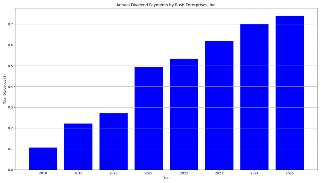 Rush demonstrates a consistent dividend track record. The company has achieved seven consecutive years of dividend growth and seven uninterrupted years of dividend payments. Since 2018, the quarterly dividend has increased from approximately $0.053 per share to the current $0.19 level. The progression reflects a disciplined capital allocation policy rather than aggressive payout expansion.