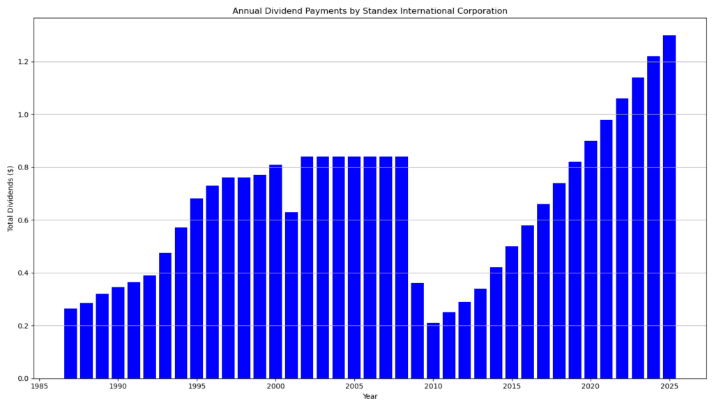 Standex blickt auf eine lange und robuste Dividendenhistorie zurück. Das Unternehmen zahlt seit 36 Jahren ohne Unterbrechung eine Dividende. Besonders relevant für Dividendeninvestoren sind die 15 aufeinanderfolgenden Jahre mit Dividendensteigerungen. Historisch zeigt sich jedoch auch, dass Standex in Krisenzeiten Anpassungen vorgenommen hat, etwa während der Finanzkrise 2009. Die aktuelle Ausschüttungspolitik wirkt daher realistisch und nicht aggressiv. Die moderate Payout Ratio erhöht die Nachhaltigkeit der Dividende, auch bei konjunkturellen Abschwüngen.