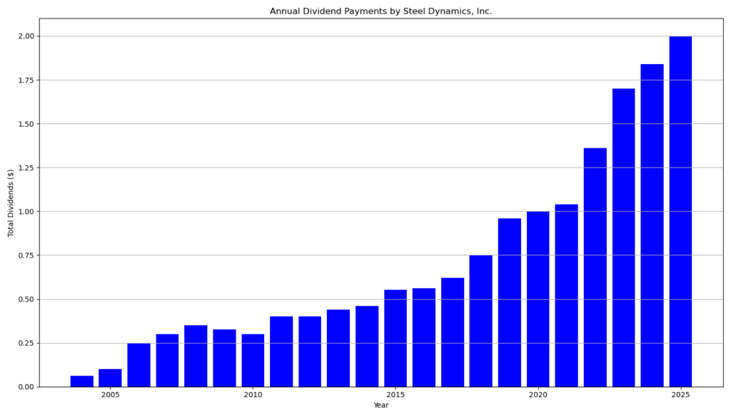 Steel Dynamics has paid dividends for 21 consecutive years and has increased its dividend for 13 consecutive years. The historical record demonstrates steady expansion, particularly since 2013. The quarterly dividend rose from $0.110 in 2013 to $0.340 in 2022, then to $0.425 in 2023, $0.460 in 2024, and $0.500 in 2025. The current increase to $0.53 extends this growth trajectory.
