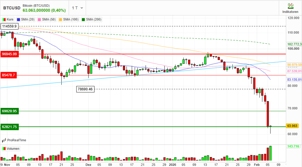 - Im Krypto-Bereich wird von einem „Blutbad“ gesprochen; Bitcoin verlor allein in einer Woche 25 % an Wert.