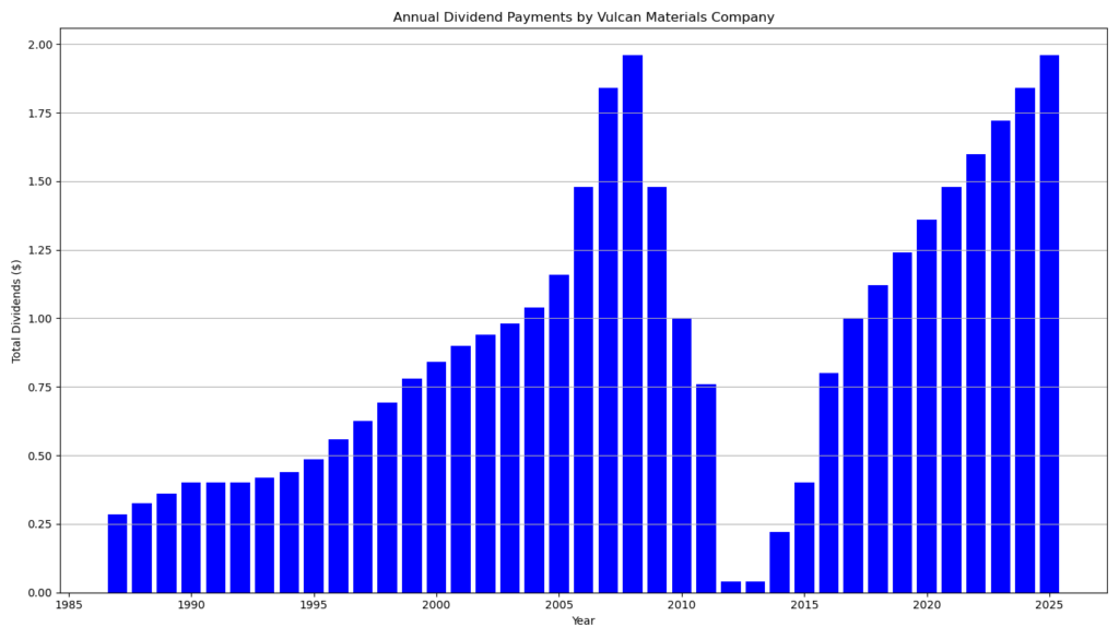 Laut aktuellen Daten weist Vulcan Materials 12 aufeinanderfolgende Jahre des Dividendenwachstums auf. Die Steigerungen erfolgen dabei sehr linear. In den letzten Jahren hob das Unternehmen die Quartalsdividende oft in Schritten von 0,03 $ an (z. B. von 0,40 $ auf 0,43 $ im Jahr 2023, dann auf 0,46 $ im Jahr 2024 und nun auf 0,49 $ im Jahr 2025 sowie aktuell auf 0,52 $). Diese Vorhersehbarkeit schätzen Einkommensinvestoren, auch wenn die absolute Rendite niedrig bleibt.
