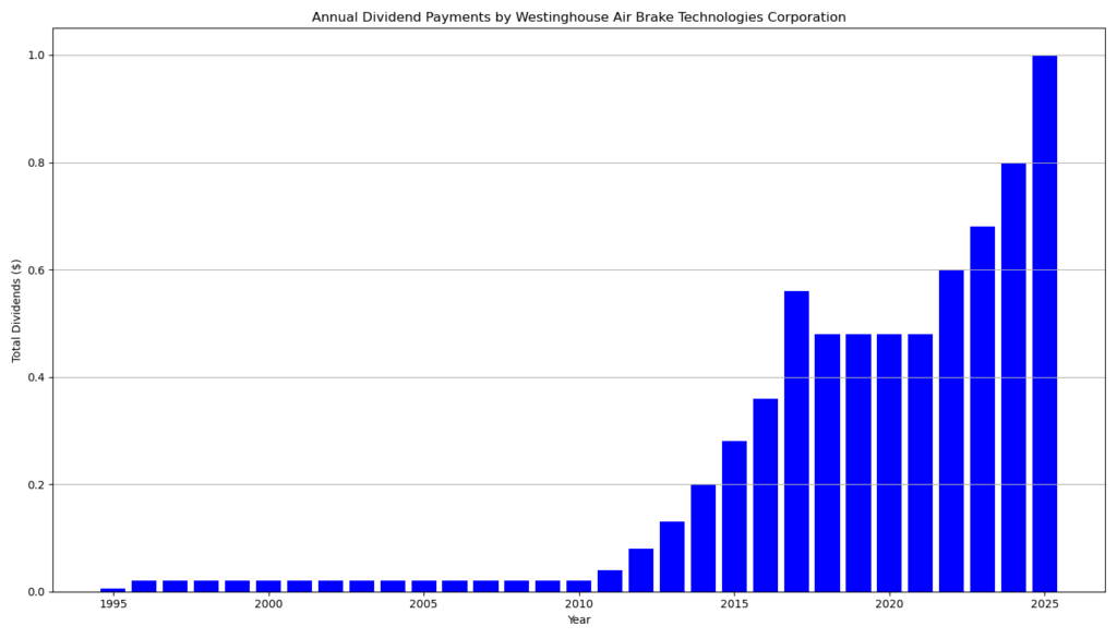 Ein Blick auf die Historie offenbart eine interessante Entwicklung in der Ausschüttungspolitik. Wabtec zahlt seit nunmehr 30 Jahren ununterbrochen Dividenden. Bemerkenswert ist jedoch der Wandel in der Dynamik der letzten Jahre. Während die Dividende von 2017 bis 2021 konstant bei 0,12 $ pro Quartal verharrte, schaltete das Management ab 2022 in einen aggressiven Wachstumsmodus um.
