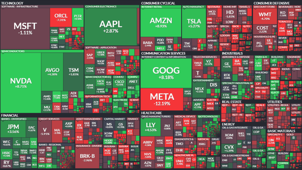 Der Motor des Marktes war unbestreitbar der Technologiesektor. Amazon-Aktien explodierten um über 10 % nach der Meldung eines unerwartet starken Wachstums im Cloud-Geschäft. Der anhaltende KI-Optimismus beflügelte auch Nvidia, das als erstes Unternehmen kurzzeitig eine Marktkapitalisierung von 5 Billionen US-Dollar erreichte. Starke Zahlen von Apple und positive Nachrichten von Netflix (Aktiensplit) und Tesla trugen ebenfalls zur Rallye der Tech-Schwergewichte bei.