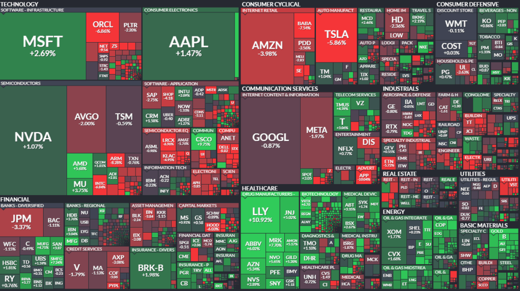 - Gesundheit & Value: Mehrfach Wochengewinner (Eli Lilly, AbbVie, Merck, Johnson & Johnson), unterstützt durch solide Q3-Zahlen und Anlegerrotation aus hoch bewerteten Tech-Werten.