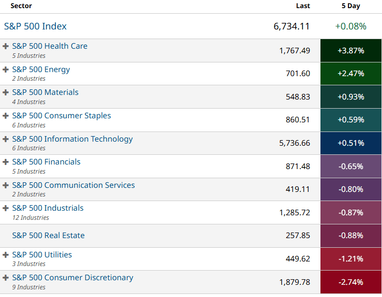 Die Woche war geprägt von extremer Unsicherheit, schwachen Arbeitsmarktsignalen und einer ungewöhnlich hohen Datenarmut durch den Shutdown. Gleichzeitig gab es eine starke Sektorrotation weg von AI-Tech hinein in Value und Healthcare, begleitet von erheblichen Tagesvolatilitäten.