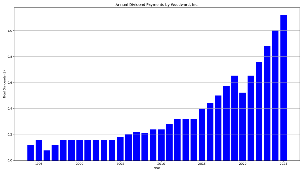 Woodward zahlt regelmäßig Quartalsdividenden, weist aber explizit darauf hin, dass zukünftige Ausschüttungen im Ermessen des Boards liegen. Die Payout Ratio ist niedrig, was die Dividende gut absichert, allerdings ist die Dividendenrendite vergleichsweise gering.
